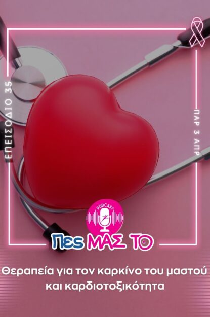 Σε αυτό το επεισόδιο του podcast «Πες ΜΑΣ ΤΟ» μιλάμε για την καρδιοτοξικότητα, μια συνθήκη που μπορεί να δημιουργηθεί από τις θεραπείες για τον καρκίνο του μαστού. Θα αναφερθούμε σε παράγοντες που αυξάνουν τις πιθανότητες εμφάνισης καρδιοτοξικότητας καθώς επίσης και στο ρόλο της καρδιο-ογκολογίας στην αντιμετώπισή της.